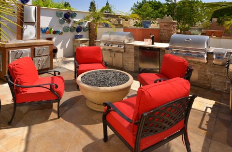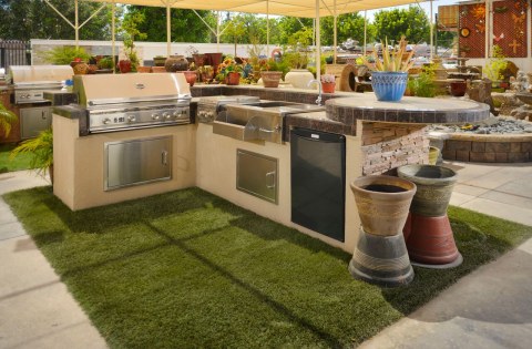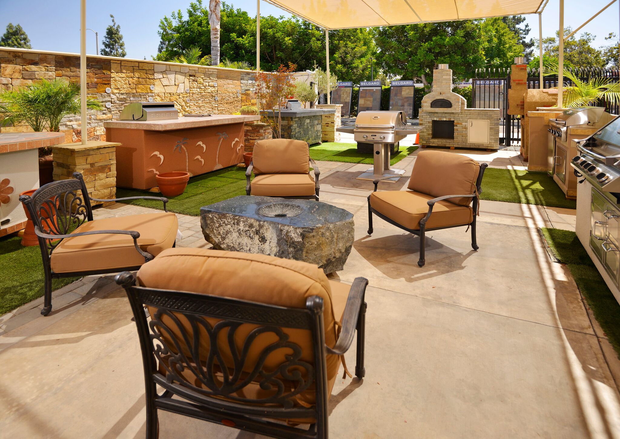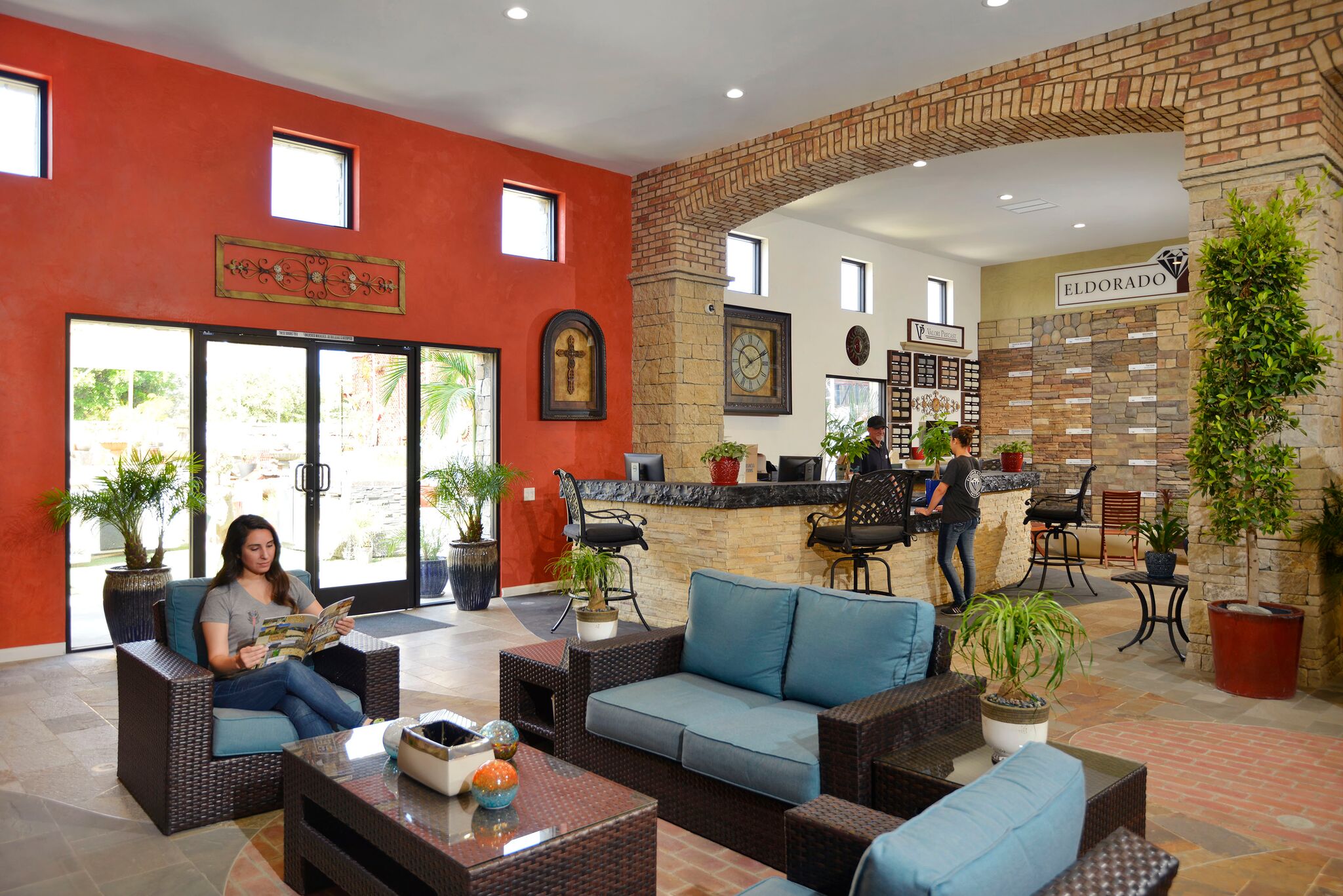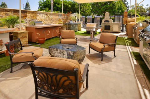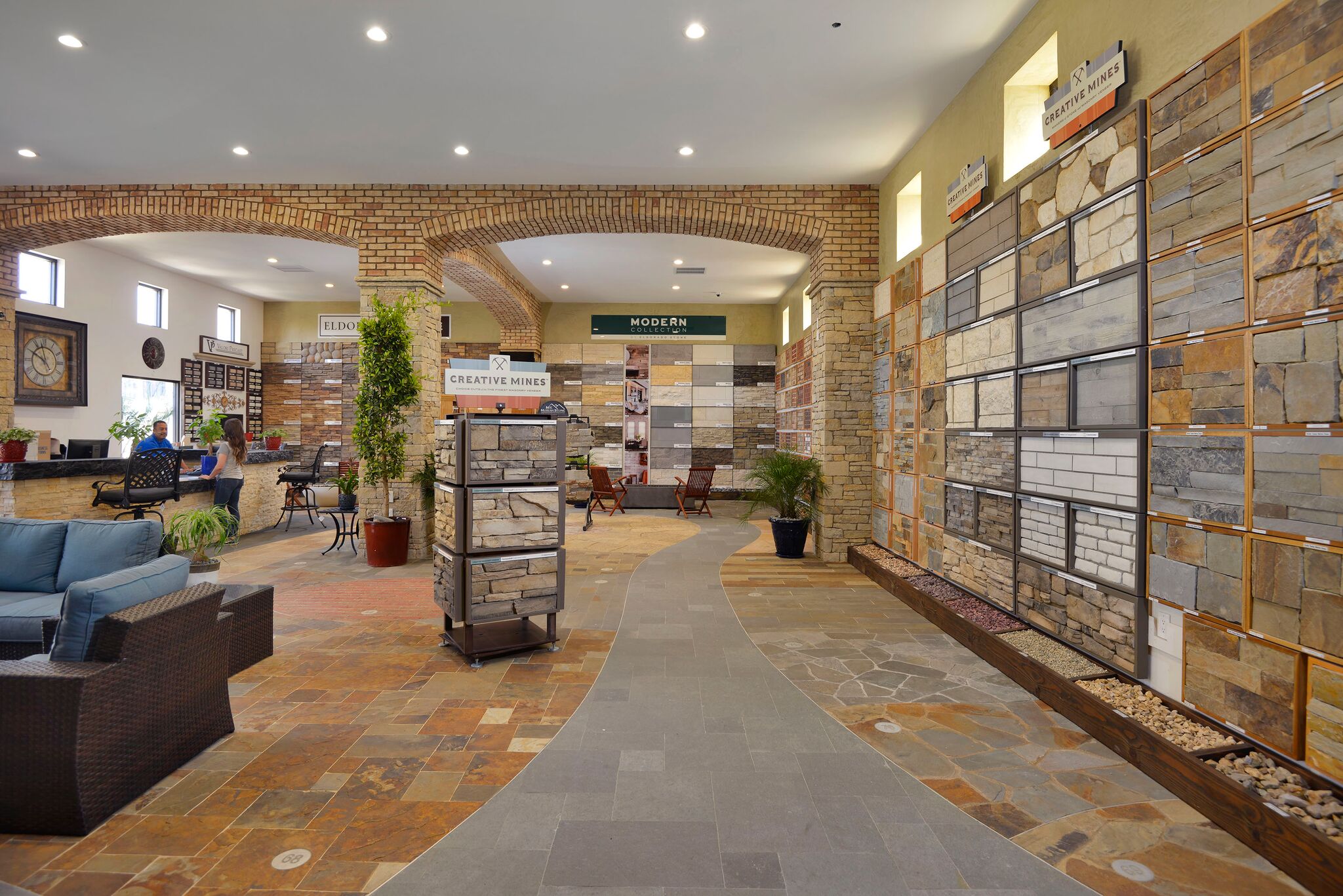 “Product selection made simple” was our primary objective in creating The Thompson Camarillo Design Center. An awesome selection of brick, natural stone & manufactured stone display boards blanket the walls allowing the consumer, builder & designer to review & compare multiple options at a glance. These displays are invaluable, illustrating how the product looks installed and allowing the variance and range of colors inherent to brick and natural stone to be viewed. No more guessing what a pallet of brick or stone will look like as your new fireplace. Outdoor displays feature custom built-in BBQ’s as well as installations of natural stone & architectural precast along with a variety of patterns & colors of interlocking concrete pavers as well as a selection of different stucco finishes & standard colors available.