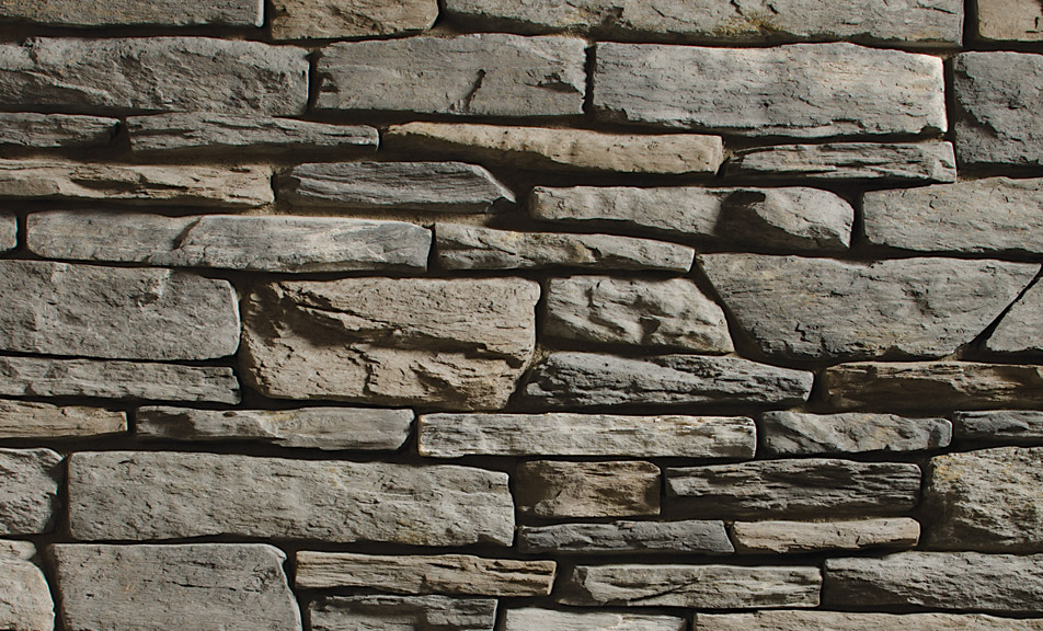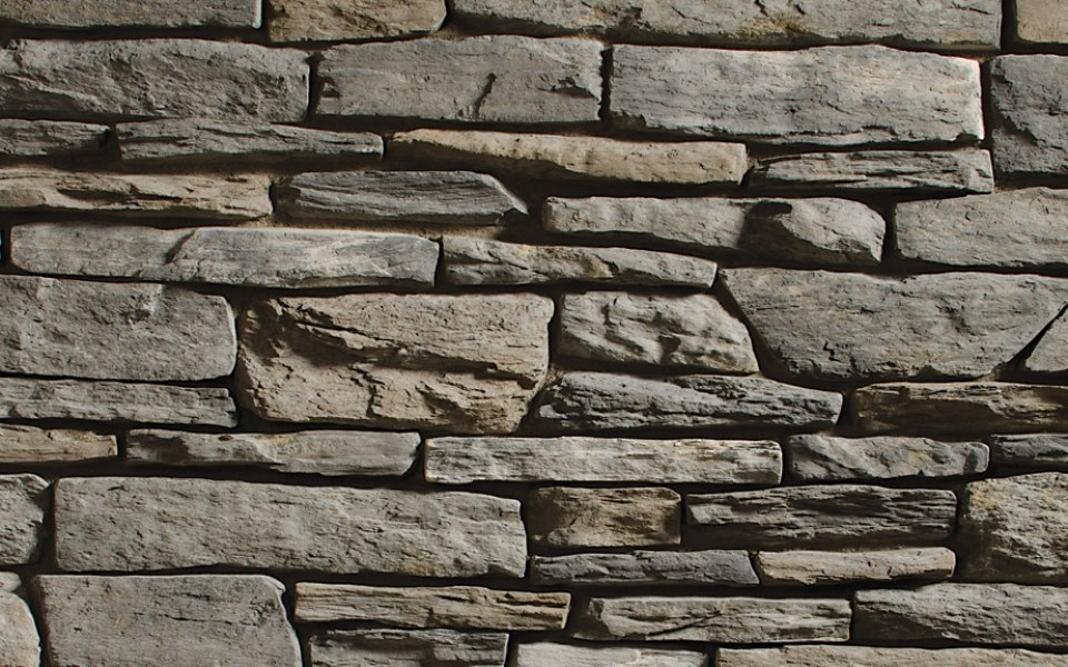 Blacktruffle Craft Trail Ledge has a deep charcoal-black palette with warm, browned gray and accents of light cream oxidation. It’s a narrow stone with rectilinear shapes, rugged, coarse faces and straight edges that casts shadows across the stone.