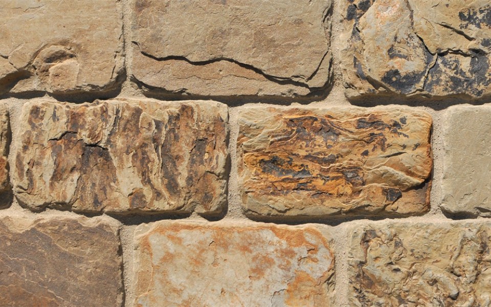 Cornhusk Quarry Barn Ledge is a tumbled, natural-face stone with both rough and smooth textures. The color palette is predominantly khaki with shades of copper, caramel and bronze with steel-gray and dark walnut accents.