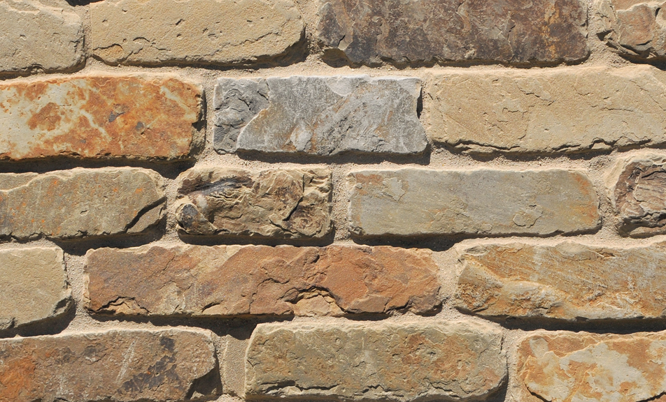 Cornhusk Quarry Cottage Ledge is a tumbled, natural-face stone with both rough and smooth textures. The color palette is predominantly khaki with shades of copper, caramel and bronze, with steel-gray and dark walnut accents.