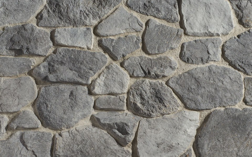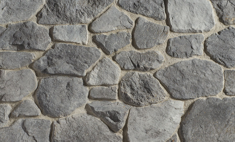 Shadowplay Craft Foothill Rubble has rustic, irregular stones that vary considerably in shape, scale and surface texture. It has a mix of midtone gray and darker gray stones with wider areas of subtle lighter gray highlights.