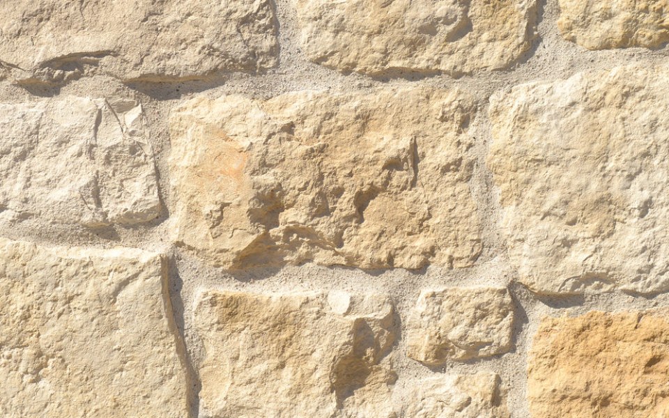 Whitegold Craft Orchard Limestone has a face that is gently cleaved and dimpled with swaths of seashell white and sandy-gray on a background of ivory. Its uneven edges and varied rectangular shapes soften the formality of an ashlar profile.